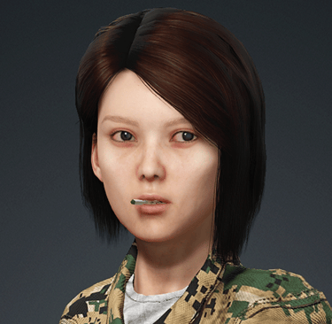 A new recruit assigned to the front lines. During missions she is frequently sneaking away for a break and has become addicted to methanol cigarettes. (CV: Yuki Kon)